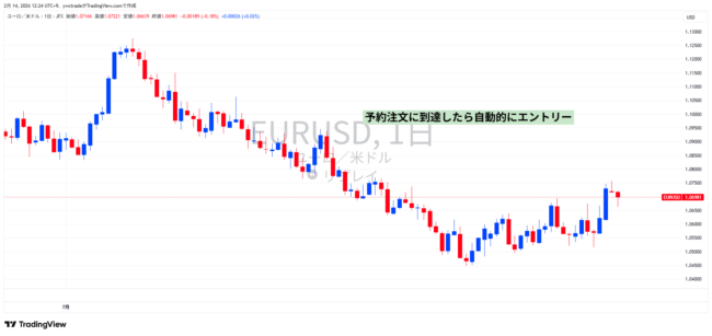 そして、予想した通りの値動きになれば、チャートを見ていない時にも自動的にエントリーが成立します。予想した値動きにならなければ、予約注文は成立しないので何も損害はありません。
